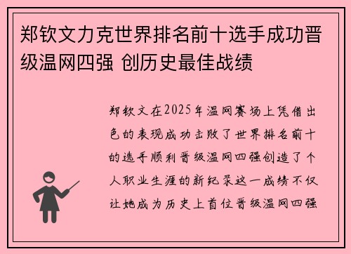 郑钦文力克世界排名前十选手成功晋级温网四强 创历史最佳战绩