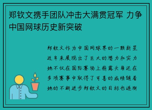 郑钦文携手团队冲击大满贯冠军 力争中国网球历史新突破