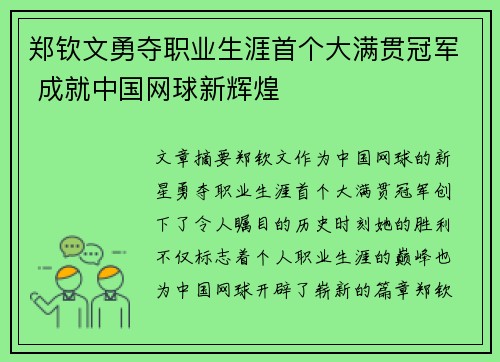 郑钦文,作为中国网球界的一颗新星,近年来展现出了巨大的潜力和实力。她不仅在国际赛场上崭露头角,还在多项赛事中取得了可喜的成绩。随着她的不断进步,郑钦文的目标也逐渐明确——冲击大满贯冠军,力争为中国网球历史写下新的篇章。为了实现这一目标,郑钦...