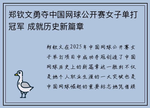 郑钦文勇夺中国网球公开赛女子单打冠军 成就历史新篇章