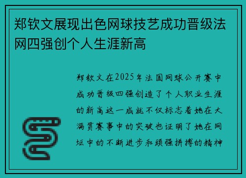 郑钦文展现出色网球技艺成功晋级法网四强创个人生涯新高