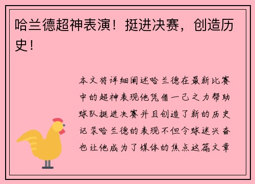 本文将详细阐述哈兰德在最新比赛中的超神表现,他凭借一己之力帮助球队挺进决赛,并且创造了新的历史记录。哈兰德的表现不但令球迷兴奋,也让他成为了媒体的焦点。这篇文章将从四个方面分析哈兰德的超神表现,探讨他的进球能力、与队友的默契配合、比赛中的关...