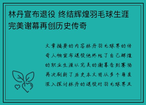 文章摘要的内容林丹,羽毛球界的传奇人物,宣布退役。他终结了自己辉煌的职业生涯,以完美的谢幕告别赛场,再次刷新了历史。本文将从多个角度深入探讨林丹的退役对羽毛球界及其影响。1、早年决定与早期成就林丹在青少年时期即展现出非凡天赋,他的早期训练和...