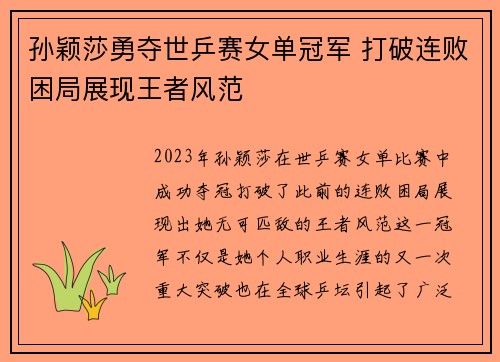 孙颖莎勇夺世乒赛女单冠军 打破连败困局展现王者风范