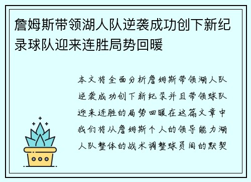 詹姆斯带领湖人队逆袭成功创下新纪录球队迎来连胜局势回暖