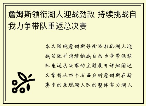 詹姆斯领衔湖人迎战劲敌 持续挑战自我力争带队重返总决赛