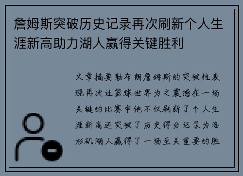 詹姆斯突破历史记录再次刷新个人生涯新高助力湖人赢得关键胜利