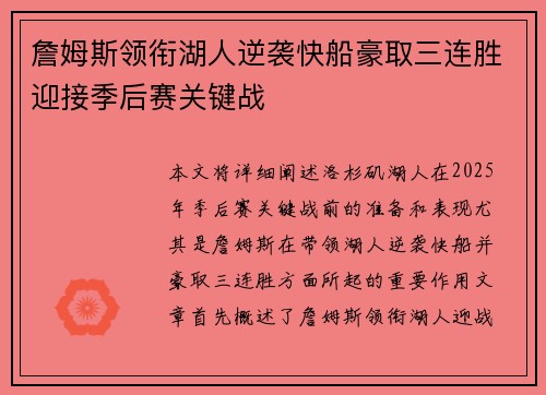 詹姆斯领衔湖人逆袭快船豪取三连胜迎接季后赛关键战
