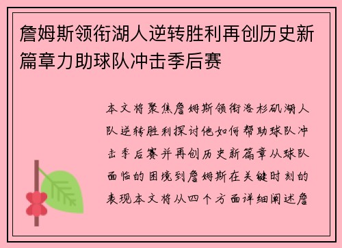 詹姆斯领衔湖人逆转胜利再创历史新篇章力助球队冲击季后赛