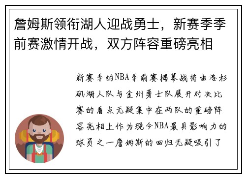 詹姆斯领衔湖人迎战勇士,新赛季季前赛激情开战,双方阵容重磅亮相