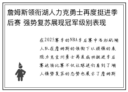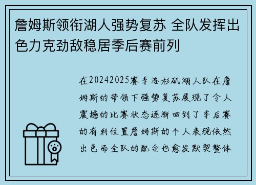 詹姆斯领衔湖人强势复苏 全队发挥出色力克劲敌稳居季后赛前列