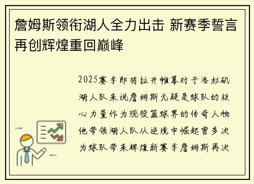 2025赛季即将拉开帷幕,对于洛杉矶湖人队来说,詹姆斯无疑是球队的核心力量。作为现役篮球界的传奇人物,他带领湖人队从逆境中崛起,曾多次为球队带来辉煌。新赛季,詹姆斯再次领衔湖人全力出击,誓言将湖人队带回巅峰,重塑辉煌。本文将从四个方面深入分...