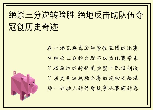 绝杀三分逆转险胜 绝地反击助队伍夺冠创历史奇迹