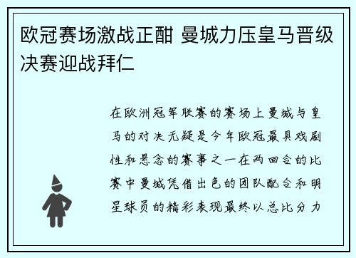 欧冠赛场激战正酣 曼城力压皇马晋级决赛迎战拜仁