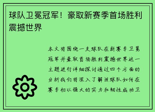 本文将围绕一支球队在新赛季卫冕冠军,并豪取首场胜利震撼世界这一主题进行详细探讨。通过四个方面的分析,我们将深入了解该球队如何在赛季初以强大的实力和韧性成功卫冕,以及这一胜利给全球球迷带来的震撼和影响。首先,我们将回顾球队在上赛季的辉煌表现以...