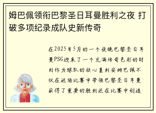 姆巴佩领衔巴黎圣日耳曼胜利之夜 打破多项纪录成队史新传奇