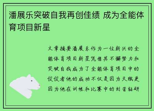 文章摘要:潘展乐,作为一位新兴的全能体育项目新星,凭借其不懈努力和突破自我,成为了全能体育项目中的佼佼者。他的成功不仅是因为天赋,更因为他在训练和比赛中的刻苦钻研与不懈追求。本文将从四个方面探讨潘展乐的成长历程和成就,包括其突破自我、创新的...