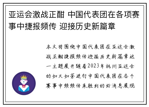 本文将围绕“中国代表团在亚运会激战正酣,捷报频传,迎接历史新篇章”这一主题展开。随着2023年杭州亚运会的如火如荼进行,中国代表团在各个赛事中频频传来胜利的好消息,展现出强大的竞技实力和坚定的决心。这些成绩不仅为中国体育赢得了国际声誉,更标...