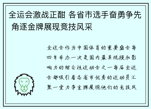 全运会作为中国体育的重要盛会,每四年举办一次,是国内最具规模和影响力的综合性运动会之一。每届全运会都吸引着各省市优秀的运动员汇聚一堂,力争金牌,展现他们的竞技风采。随着本届全运会的激烈角逐进入高潮,各省市选手纷纷奋勇争先,竞争异常激烈。本文...