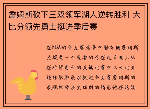 在NBA的季后赛竞争中,勒布朗·詹姆斯无疑是一个重要的存在。近日,湖人队在对阵勇士的关键比赛中,以大比分逆转取胜,成功挺进季后赛,詹姆斯的表现堪称历史级别的精彩。他在这场比赛中不仅砍下了三双,还以全能的个人能力引领湖人逆转局面,超越了勇士的...