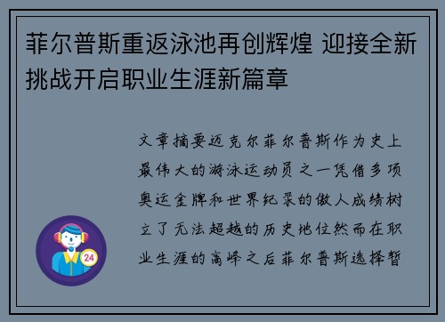 菲尔普斯重返泳池再创辉煌 迎接全新挑战开启职业生涯新篇章