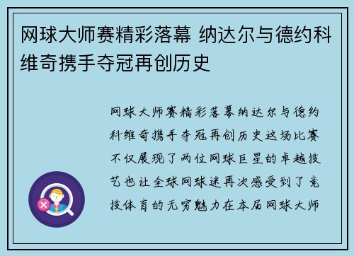 网球大师赛精彩落幕 纳达尔与德约科维奇携手夺冠再创历史