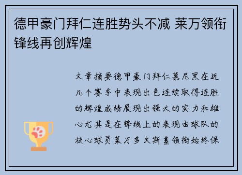 德甲豪门拜仁连胜势头不减 莱万领衔锋线再创辉煌