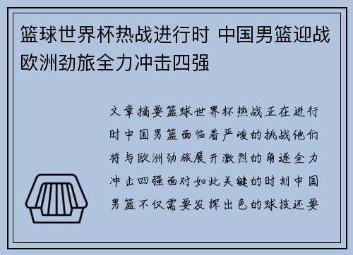篮球世界杯热战进行时 中国男篮迎战欧洲劲旅全力冲击四强