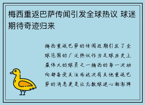 梅西重返巴萨的传闻近期引发了全球范围的广泛热议。作为足球历史上最伟大的球员之一,梅西的每一次动向都备受关注,而这次有关他重返巴萨的消息,更是让无数球迷心潮澎湃。文章将从四个方面详细探讨梅西重返巴萨的传闻为何引发如此轰动,球迷们又是如何期待这...