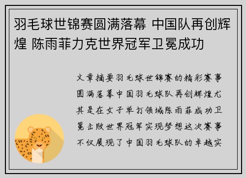 羽毛球世锦赛圆满落幕 中国队再创辉煌 陈雨菲力克世界冠军卫冕成功