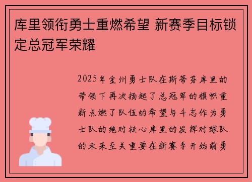 库里领衔勇士重燃希望 新赛季目标锁定总冠军荣耀