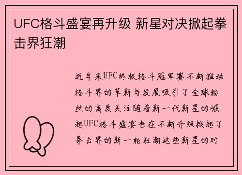 UFC格斗盛宴再升级 新星对决掀起拳击界狂潮