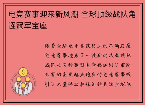 随着全球电子竞技行业的不断发展,电竞赛事迎来了一波新的风潮,顶级战队之间的激烈竞争也达到了前所未有的高度。越来越多的电竞赛事吸引了大量观众和媒体的关注,全球范围内的顶级战队争夺冠军宝座的战斗成为了电子竞技界的焦点。电竞赛事不仅仅是一场场竞技...