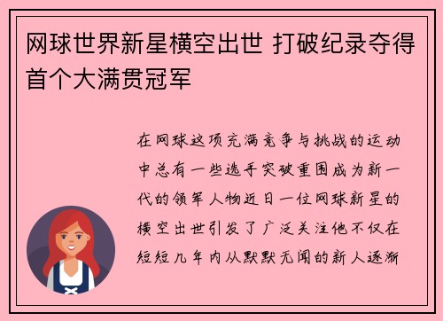 在网球这项充满竞争与挑战的运动中,总有一些选手突破重围,成为新一代的领军人物。近日,一位网球新星的横空出世引发了广泛关注。他不仅在短短几年内从默默无闻的新人逐渐崭露头角,而且在各大赛事中屡创佳绩,最终打破纪录,夺得了属于自己的第一个大满贯冠...