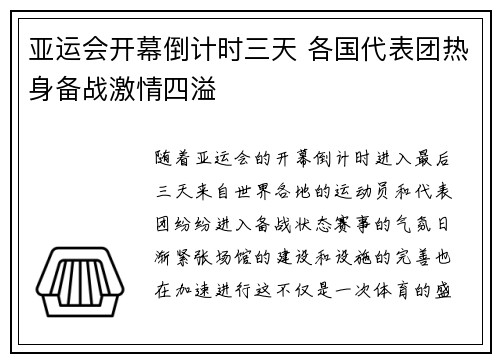 随着亚运会的开幕倒计时进入最后三天,来自世界各地的运动员和代表团纷纷进入备战状态。赛事的气氛日渐紧张,场馆的建设和设施的完善也在加速进行。这不仅是一次体育的盛会,更是各国代表团展示实力和风采的舞台。从赛场上的热身训练到队伍间的默契配合,各国...