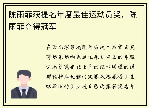 陈雨菲获提名年度最佳运动员奖,陈雨菲夺得冠军