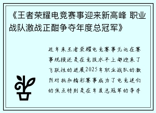 近年来,《王者荣耀》电竞赛事无论在赛事规模还是在竞技水平上都迎来了飞跃性的进展。2025年,职业战队的激烈对抗和精彩赛事成为了电竞迷们的焦点,特别是在年度总冠军的争夺战中,各大顶级战队激战正酣,为最终的荣耀之巅展开了殊死搏斗。本文将从四个方...