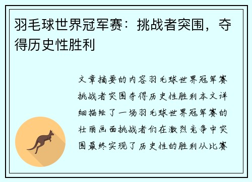 文章摘要的内容:羽毛球世界冠军赛:挑战者突围,夺得历史性胜利。本文详细描绘了一场羽毛球世界冠军赛的壮丽画面,挑战者们在激烈竞争中突围,最终实现了历史性的胜利。从比赛前的准备到决赛的紧张对决,每个阶段都体现了运动员的顶尖技艺与不懈努力。...