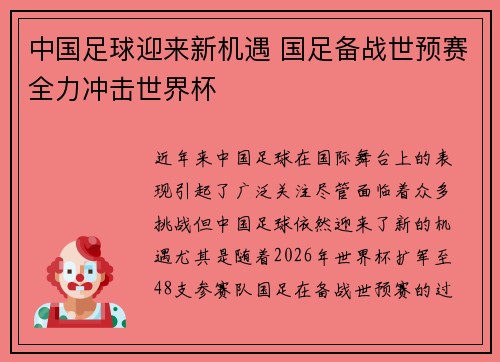 近年来,中国足球在国际舞台上的表现引起了广泛关注,尽管面临着众多挑战,但中国足球依然迎来了新的机遇。尤其是随着2026年世界杯扩军至48支参赛队,国足在备战世预赛的过程中,充满了更大的希望和潜力。本文将从四个方面进行详细阐述,分析中国足球如...