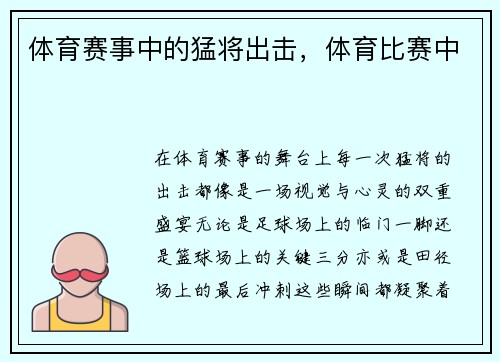 在体育赛事的舞台上,每一次猛将的出击都像是一场视觉与心灵的双重盛宴。无论是足球场上的临门一脚,还是篮球场上的关键三分,亦或是田径场上的最后冲刺,这些瞬间都凝聚着运动员的汗水、智慧与决心。猛将,是那些在关键时刻挺身而出、力挽狂澜的英雄,他们的...