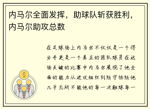 内马尔全面发挥,助球队斩获胜利,内马尔助攻总数