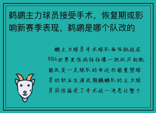 鹈鹕主力球员接受手术,恢复期或影响新赛季表现,鹈鹕是哪个队改的