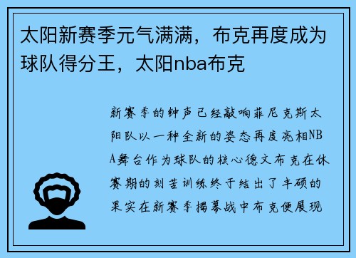 太阳新赛季元气满满,布克再度成为球队得分王,太阳nba布克