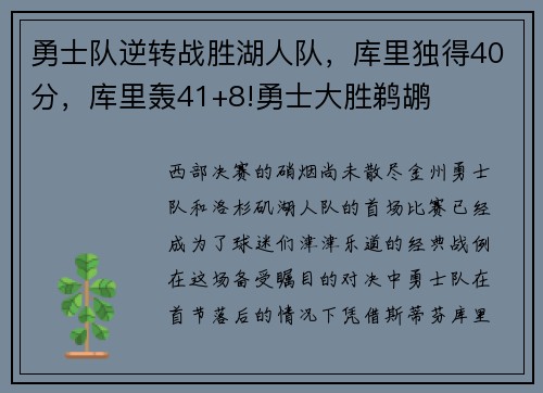 勇士队逆转战胜湖人队,库里独得40分,库里轰41+8!勇士大胜鹈鹕
