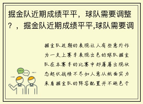 掘金队近期成绩平平,球队需要调整?,掘金队近期成绩平平,球队需要调整吗
