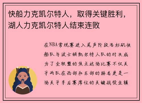 快船力克凯尔特人,取得关键胜利,湖人力克凯尔特人结束连败