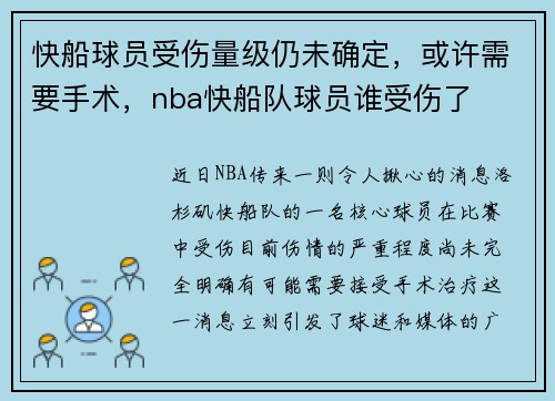快船球员受伤量级仍未确定,或许需要手术,nba快船队球员谁受伤了