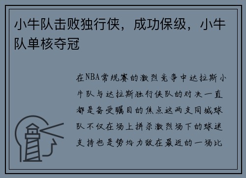 小牛队击败独行侠,成功保级,小牛队单核夺冠