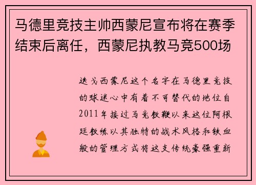 马德里竞技主帅西蒙尼宣布将在赛季结束后离任,西蒙尼执教马竞500场