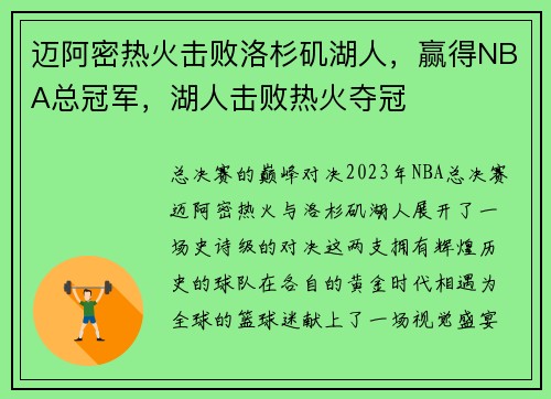 迈阿密热火击败洛杉矶湖人,赢得NBA总冠军,湖人击败热火夺冠